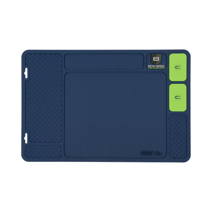 Description / Breakthrough Clean Technologies SHIELD Series Fishing Reel Cleaning Mat - Embedded Magnets & Tool Compartments + Heavy-Duty PVC – Universal Size Maintenance Pad - Blue/Green